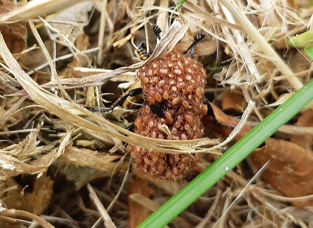 Mr E sends a picture of a Maritime Earwig having rather a lot of trouble with spider webbing on driftwood at Devonian Park, June 7.